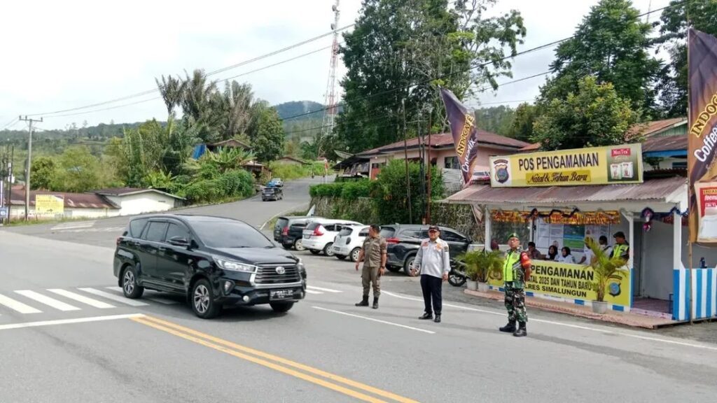 Babinsa Kodim 0207/Simalungun Serma R. Barus dan Sertu Slamet Raharjo melaksanakan kegiatan Operasi Pengamanan dan Pelayanan (Ops Yan) Operasi Lilin Nataru 2025 di Pos Pengamanan (Pos Pam) IV Simpang Sitahoan, Kecamatan Girsang Sipangan Bolon, Kabupaten Simalungun. Jumat, 26/12/2025